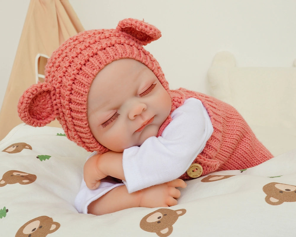 Drifting in the sweetest dreams, Poppy is dressed in adorable pink knitted overalls and a matching bear-eared hat, snuggled close with her tiny teddy bear. Her serene sleeping face, gentle pose, and delicate details capture the pure innocence of baby slumber, ready to fill your arms with quiet affection and warmth.