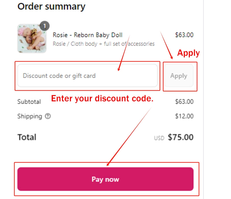 Apply your discount code, then click the "Pay Now" button to finish your order.