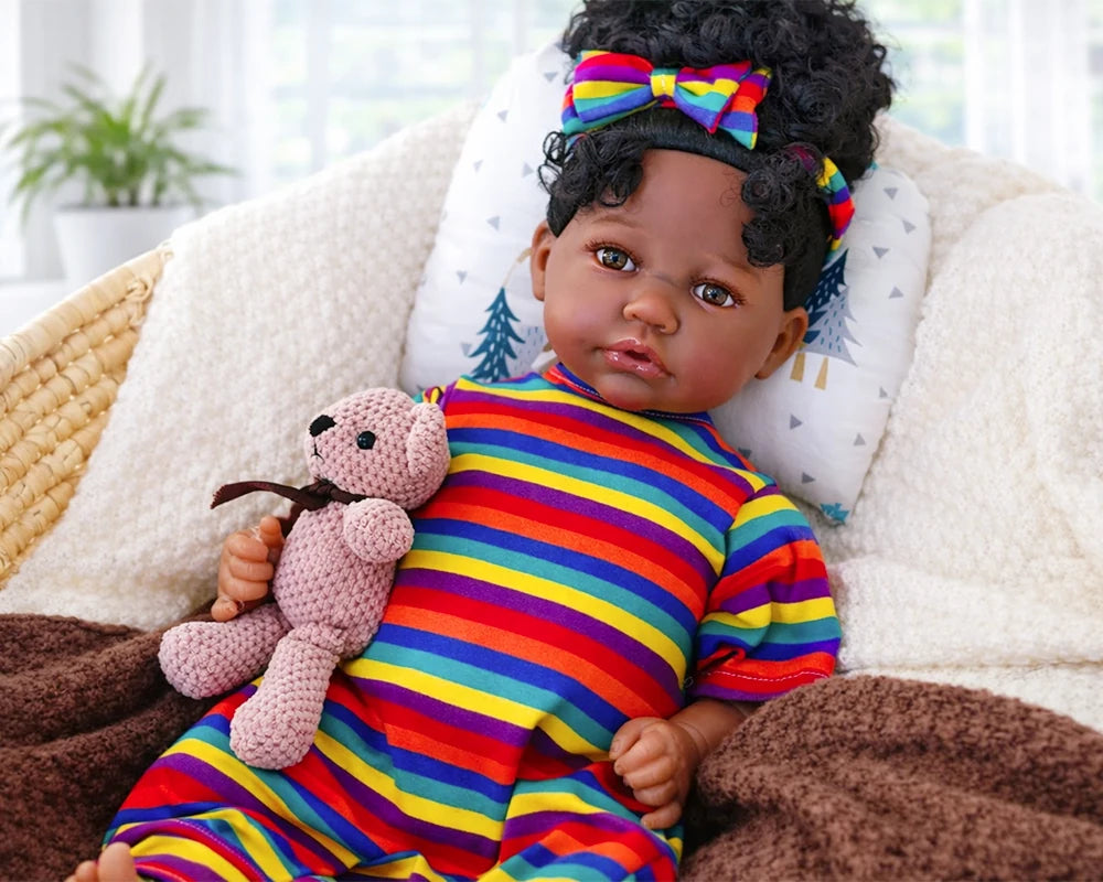 Zara is a little bundle of color and joy. Her bright dark-brown eyes shine with curiosity, and her soft curls frame a face full of warmth and charm. Dressed in a cheerful rainbow-striped outfit with a matching bow, she holds her knitted teddy bear close, ready for happy moments. Her soft, huggable body and lifelike skin details, enhanced with delicate hand-painted artistry, bring her to life in the most captivating way.