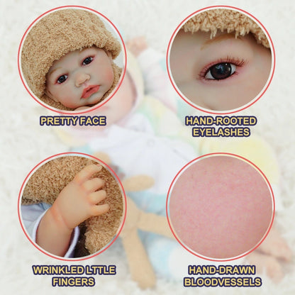 Oliver te mira con sus brillantes ojos abiertos, extendiendo la mano como invitándote a acercarte. Vestido con un suave conjunto marrón de textura, un gorro de lana beige y una bufanda de peluche con un osito de peluche de peluche, transmite la tierna calidez de un bebé de verdad. Su rostro dulce y sus rasgos finamente detallados están plasmados con un realismo asombroso, llenos de vida y encanto.