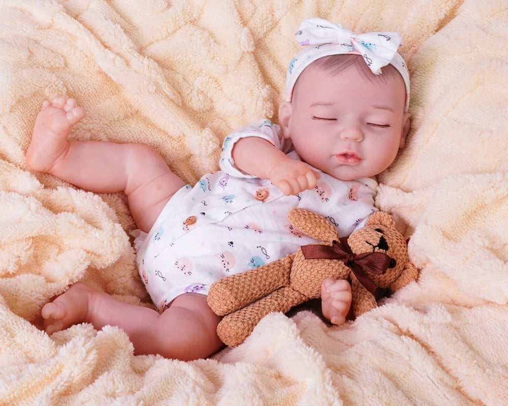 Les presento a Amelia, una dulce bebé que duerme plácidamente acurrucada junto a su osito de peluche marrón de punto. Viste un suave mameluco blanco con un estampado de ositos de colores, a juego con una diadema: una imagen de puro encanto. Su cuerpo suave y abrazable invita a acurrucarse, mientras que la textura realista de su piel y los delicados detalles pintados a mano dan vida a su rostro sereno y a su pequeña figura, como la de un bebé de verdad durmiendo.