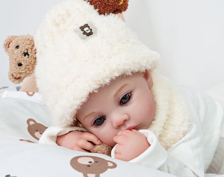 Milo es un bebé reborn que transmite ternura desde el primer instante. Sus ojos azules y brillantes, junto con su suave gorrito y bufanda a juego, crean una imagen dulce y acogedora que invita a abrazarlo. Sostiene su pequeño peluche con una expresión tranquila que conecta fácilmente con los niños.