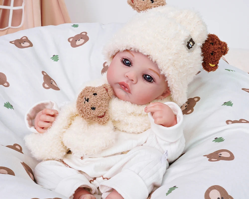 Una muñeca con cuerpo de tela tiene cabeza, brazos y piernas de vinilo, mientras que el torso está hecho de tela. Permite colocarla de forma más natural, ya que el cuerpo es flexible y puede moverse y adaptarse a diferentes posturas. Al sostenerla, se siente más suave, como abrazar a un bebé. Es ideal para abrazar, para practicar cómo cargar a un bebé o para niños que disfrutan cuidando de su “bebé”.