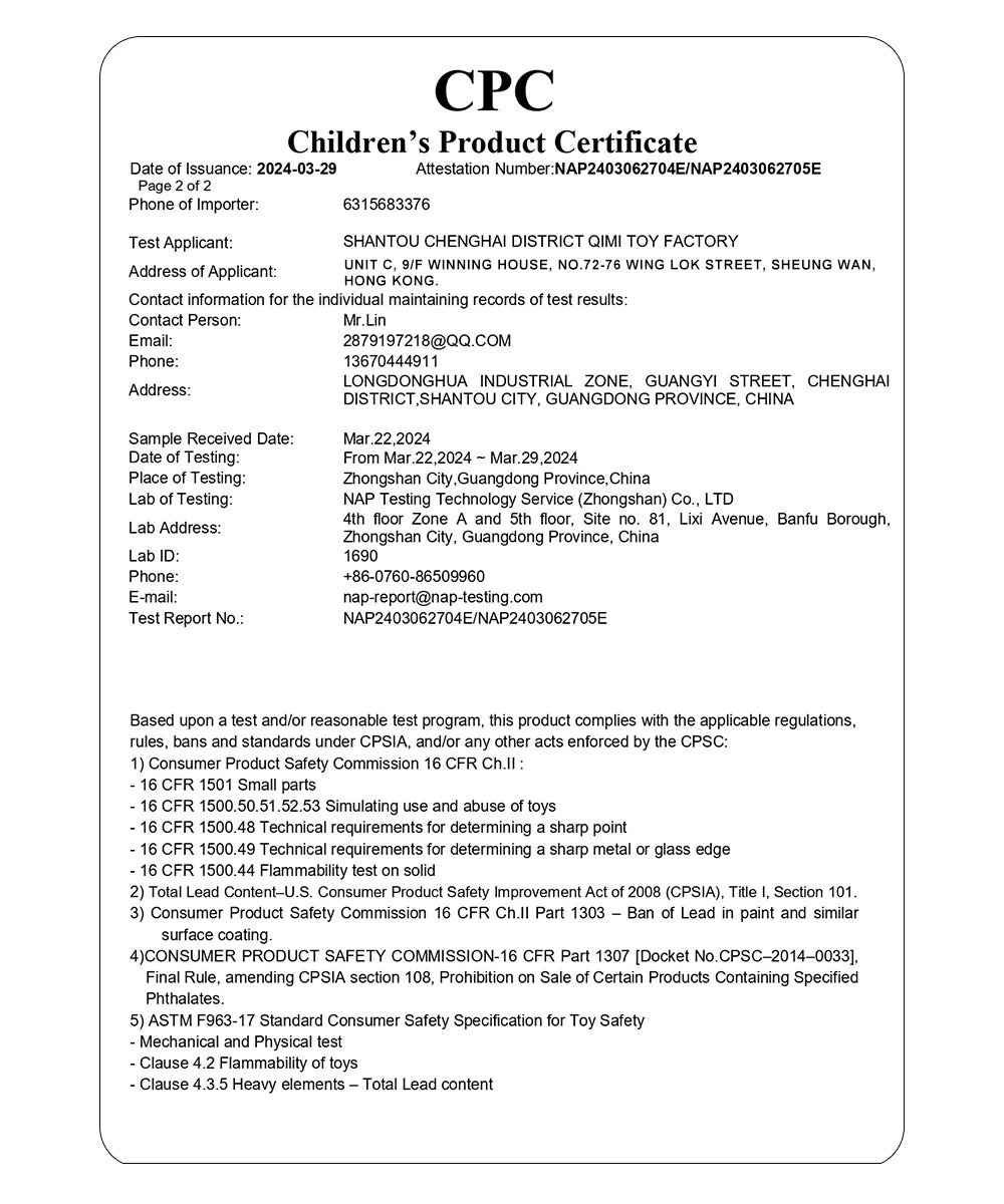 El CPC (Certificado de Producto Infantil) es un documento obligatorio que acredita el cumplimiento de la CPSIA y otras normas de seguridad. Exige que los productos se sometan a múltiples pruebas, incluyendo límites de contenido de plomo, ftalatos y seguridad mecánica, para garantizar su seguridad para los niños.