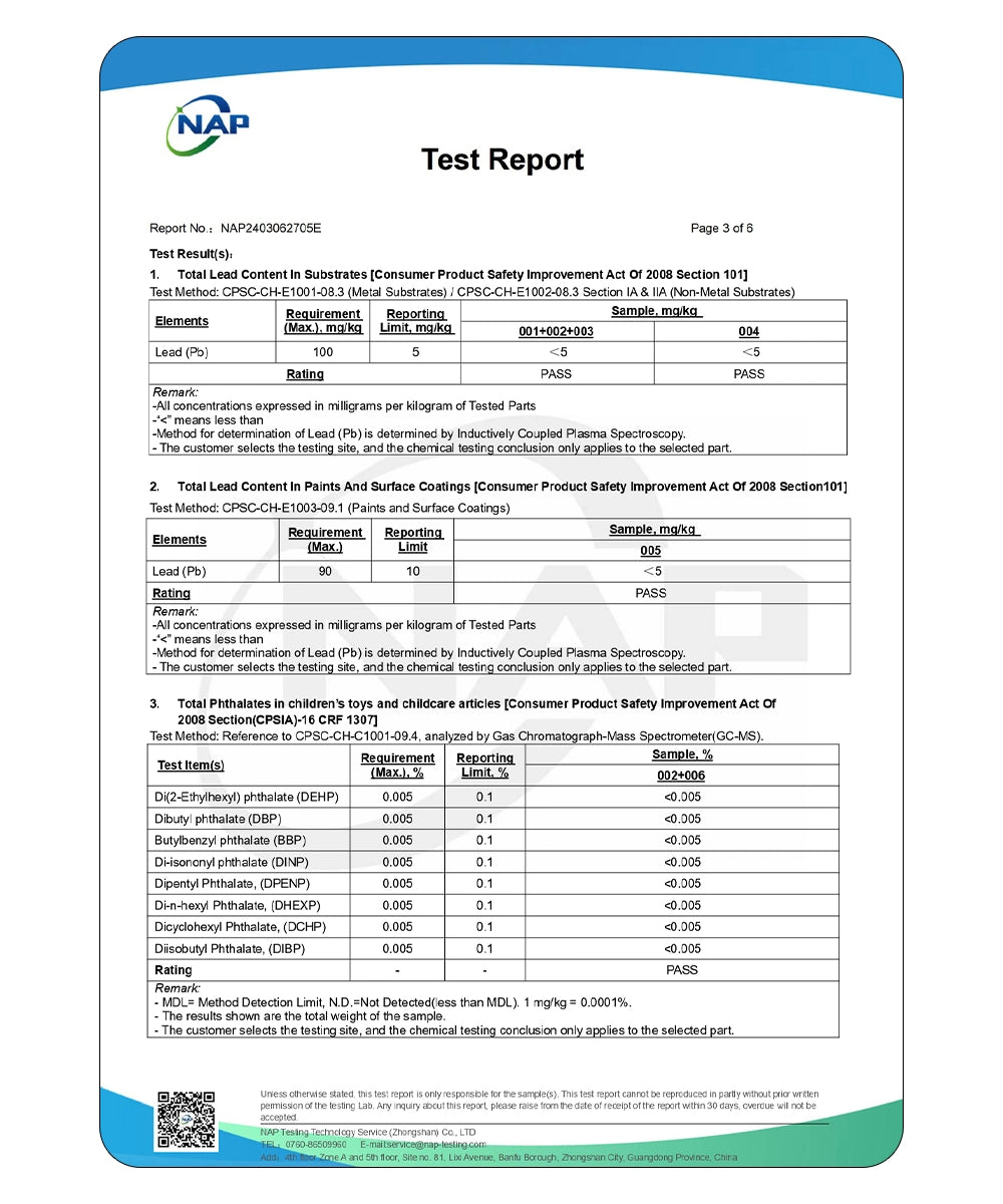 La CPSIA (Ley de Mejora de la Seguridad de los Productos de Consumo) exige que los productos se sometan a múltiples pruebas, incluidos límites en el contenido de plomo, ftalatos y seguridad mecánica, para garantizar que sean seguros para los niños.
