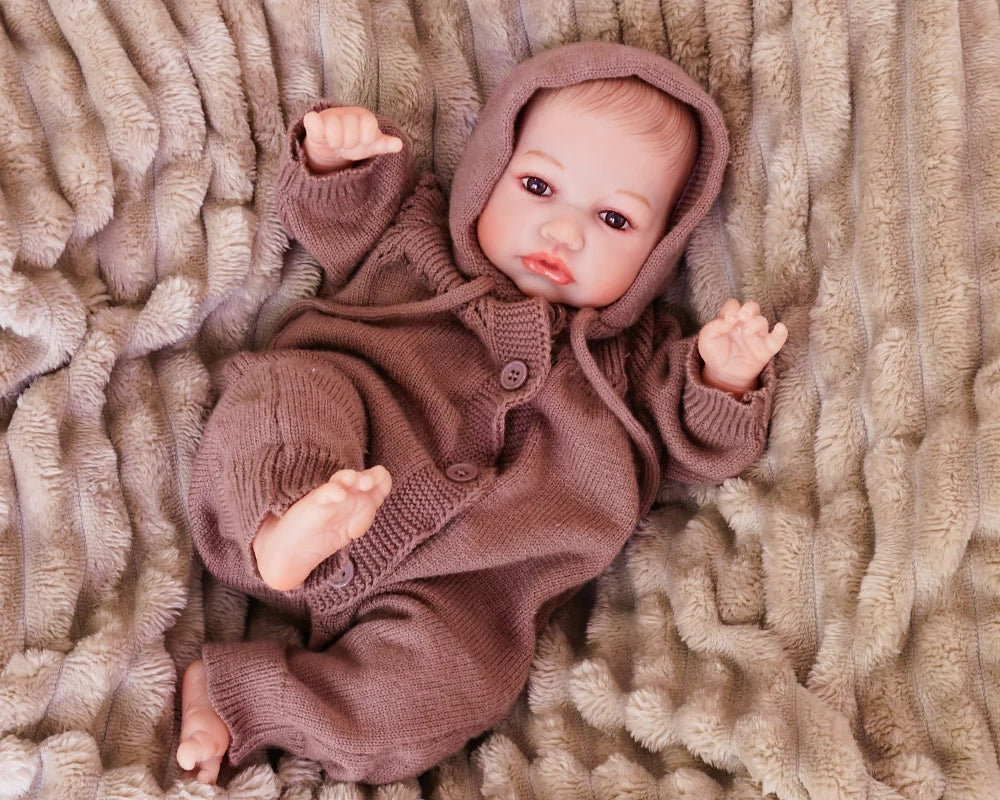 Con los ojos bien abiertos, Alex está listo para explorar su pequeño mundo. Vestido con un cómodo traje marrón con capucha, parece un pequeño aventurero, lleno de calidez y asombro. Su cuerpo suave y abrazable, junto con los detalles de su piel, pintados a mano con esmero, le dan el delicado realismo de un recién nacido.