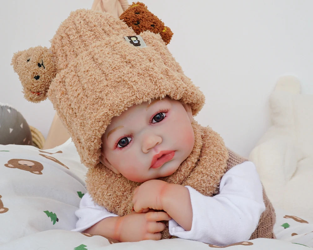 Admirez le doux bébé Oliver, les yeux grands ouverts, une invitation à la rencontre. Son allure charmante est complétée par une tenue marron douce et texturée, un bonnet beige douillet et une écharpe en peluche ornée d'un petit ours en tricot. Admirez les détails réalistes de son doux visage : chaque trait est conçu pour capturer le charme innocent d'un vrai bébé.