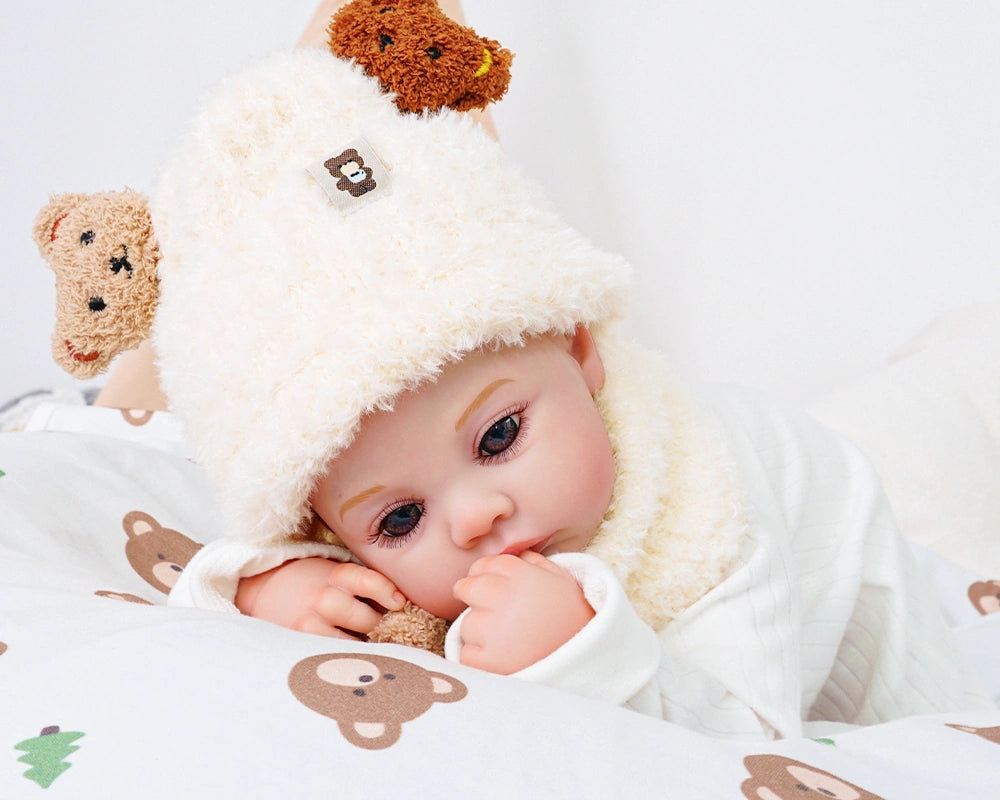 Avec ses yeux bleus et brillants comme le ciel, Milo est une adorable poupée reborn prête à conquérir votre cœur. Coiffé d'un bonnet blanc duveteux, assorti d'une écharpe douillette et vêtu d'une douce tenue blanche, il serre tendrement son petit ours en peluche contre lui, son expression curieuse débordant de tendresse et d'émerveillement.