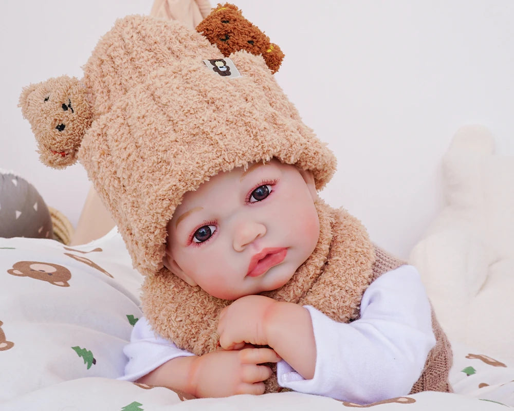 Oliver lève les yeux vers vous, ses grands yeux brillants tendus comme pour vous inviter à vous approcher. Vêtu d'une douce tenue brune à la texture agréable, d'un bonnet beige tricoté tout doux et d'une écharpe duveteuse à motifs d'oursons tenant un petit ourson tricoté, il capture la tendresse d'un vrai bébé. Son visage délicat et ses traits finement détaillés sont d'un réalisme saisissant, pleins de vie et de charme.