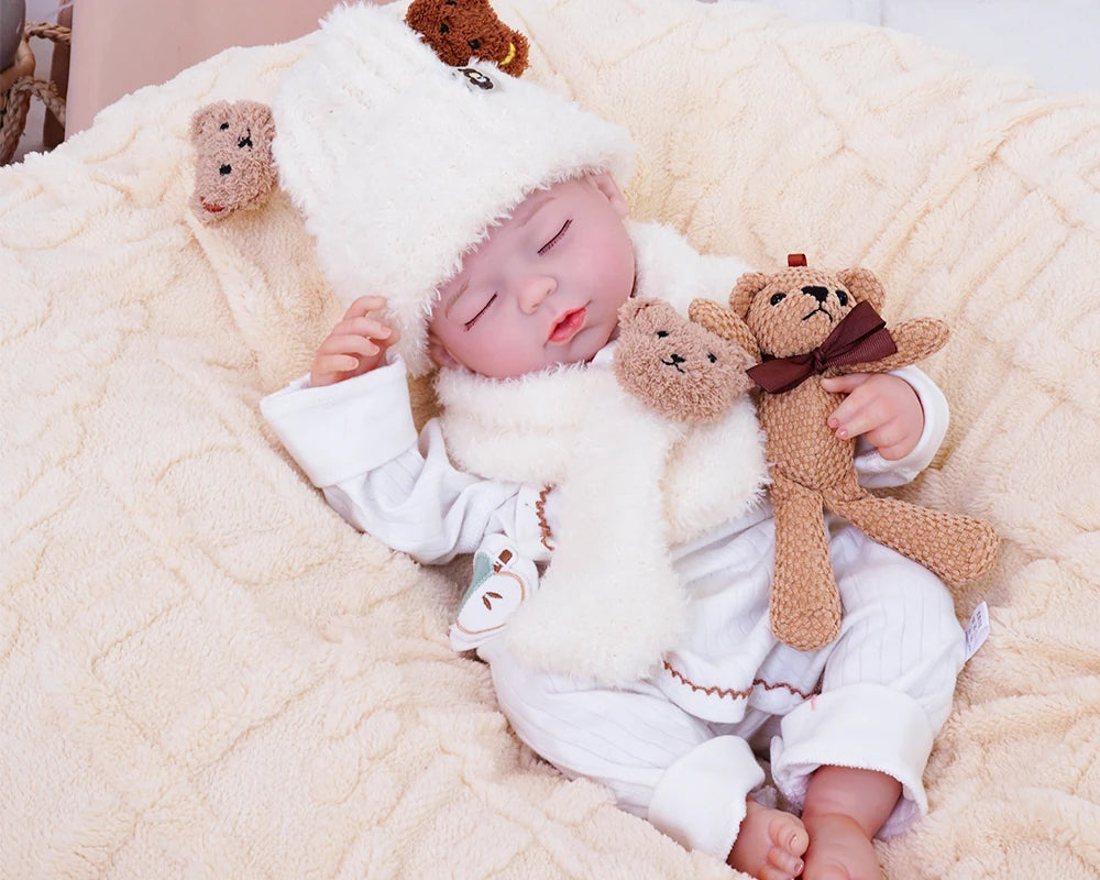 Zoé est un petit ange de douceur, blottie dans un sommeil paisible. Vêtue d'une adorable tenue blanche duveteuse, coiffée d'un bonnet à oreilles d'ours assorti, d'une écharpe douillette et accompagnée de son petit ami ours, elle incarne à la perfection le charme serein. Son corps doux et câlin, sa peau réaliste et ses détails finement peints à la main lui donnent l'apparence et la texture d'un véritable bébé endormi.